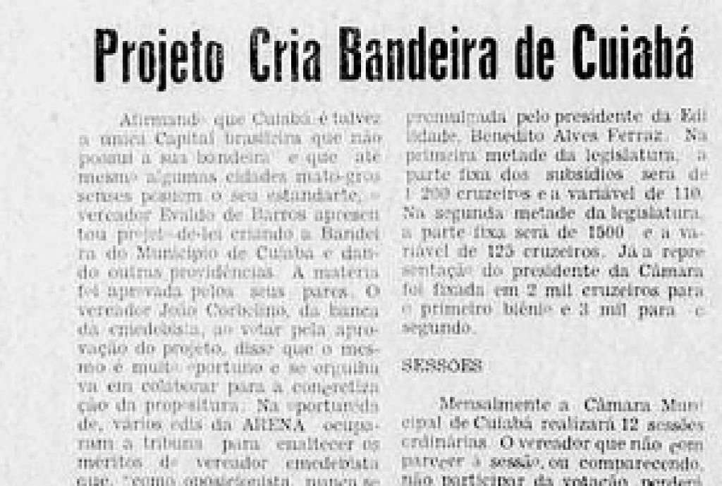 Na sessão do dia 9 de agosto de 1972 foi colocado em pauta um projeto de lei de autoria do vereador Evaldo de Barros. No projeto, o vereador apresentava a proposta de criação da bandeira de Cuiabá, requerendo urgência em sua tramitação. Evaldo de Barros justificava a urgência porque desejava que a bandeira da cidade fosse hasteada pela primeira vez no dia 7 de setembro, nas comemorações pelos 150 anos da Independência do Brasil. Na Justificativa do seu projeto, o vereador afirmava que Cuiabá era talvez a única capital do país a não possuir uma bandeira, e que ainda, algumas cidades mato-grossenses, até as recém-criadas, já tinham as suas bandeiras, e por isso, pediu aos pares o apoio irrestrito a sua proposta.