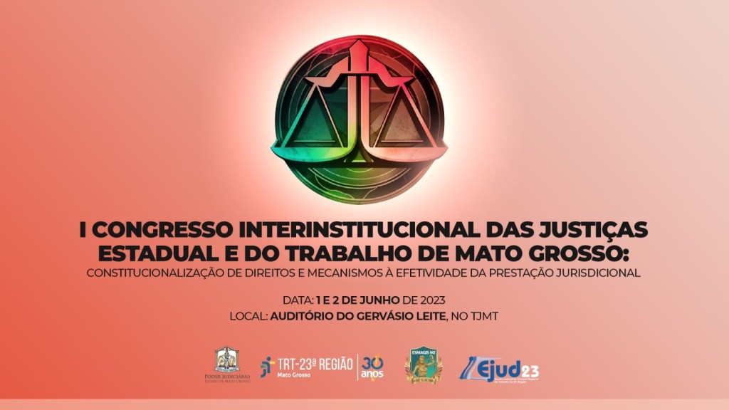 Atenção, magistrados, magistradas e integrantes do sistema de justiça que residem fora de Cuiabá! Foram abertas vagas para participação virtual no “I Congresso Interinstitucional das Justiças Estadual e do Trabalho de Mato Grosso: Constitucionalização de Direitos e Mecanismos à Efetividade da Prestação Jurisdicional”, que será realizado nesta quinta e sexta-feira (1º e 2 de junho), pela Escola Superior da Magistratura de Mato Grosso (Esmagis-MT) e Escola Judicial da 23ª Região (Ejud23). O evento será no Auditório do Gervásio Leite, na sede do Tribunal de Justiça de Mato Grosso (TJMT). O público-alvo do congresso são os magistrados(as) e servidores(as) do Poder Judiciário de Mato Grosso, do Tribunal Regional do Trabalho 23ª Região, integrantes e membros do sistema de Justiça. Clique neste link para se inscrever, tanto na modalidade presencial quanto virtual. As inscrições seguem até quarta-feira (31 de maio).