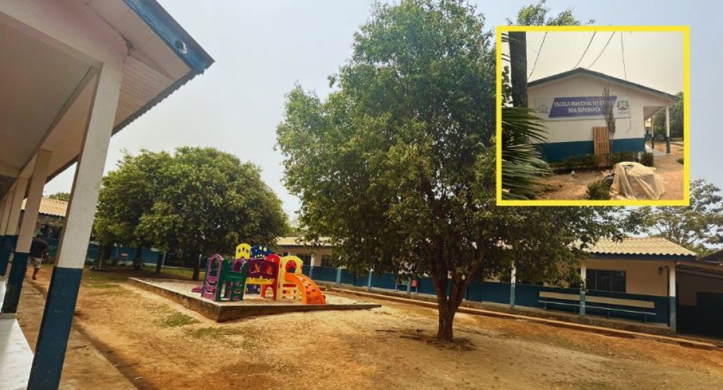 #PraTodosVerem – A imagem mostra a vista do pátio interno de uma escola, com um grande pátio de terra batida e uma área de lazer infantil colorida sob a sombra de uma árvore central de grande porte. A arquitetura da escola é simples, com corredores cobertos e estruturas de um único piso pintadas de branco e azul na base. Em destaque no canto superior direito (em um inset amarelo), há uma foto de detalhe da fachada de um dos prédios, onde se pode ler parcialmente a identificação: “ESCOLA MUNICIPAL DO CAMPO BOA ESPERANÇA”.