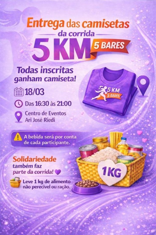 Inscritas para a “Corrida 5 Km 5 Bares” que será realizada nesse sábado, dia 21 de março, devem retirar as camisetas nesta quarta-feira, 18, e na quinta-feira, dia 19. No dia 18 a entrega das camisetas será realizada no Auditório Magessi no Centro de Eventos Ari José Riedi no Rota do Sol das 16h30 às 21 horas; já no dia 19 a entrega será na Praça das Fontes também das 16h30 às 21 horas.