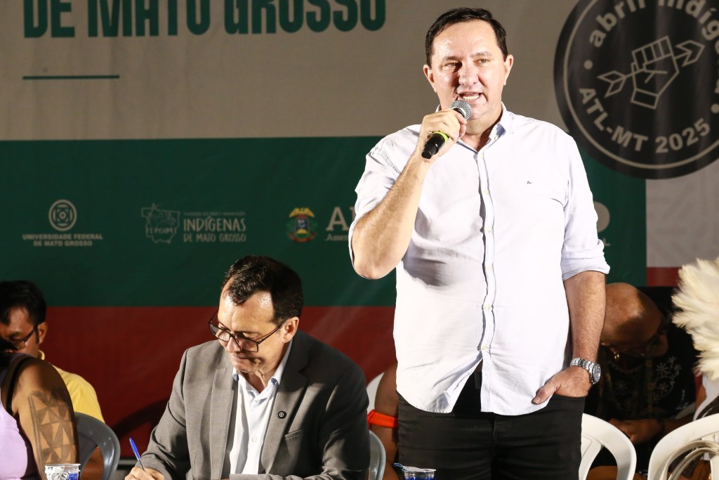 O deputado estadual Valdir Barranco (PT) participou, na tarde desta segunda-feira (28), da audiência pública do 3º Acampamento Terra Livre de Mato Grosso (ATL-MT), realizado na Universidade Federal de Mato Grosso (UFMT), em Cuiabá. Presidido pelo deputado Lúdio Cabral (PT), o encontro reuniu representantes das 43 etnias indígenas do estado, órgãos públicos, sociedade civil e aliados históricos da causa indígena para discutir caminhos para uma economia sustentável e com protagonismo indígena, especialmente diante da proximidade da COP30, que acontecerá no Brasil, em Belém (PA), em 2025.