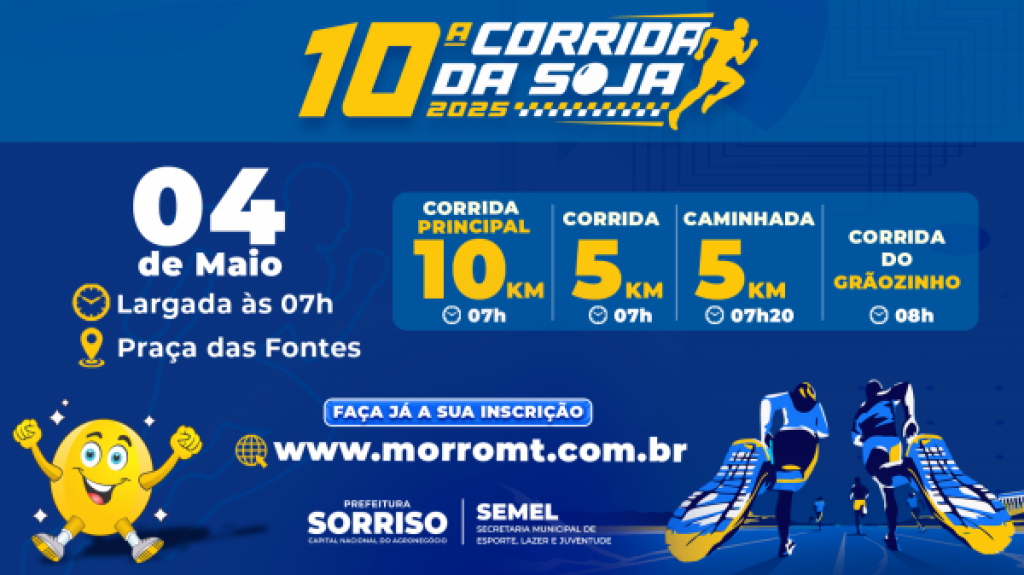 Amanhã, quarta-feira (30), é o último dia para se inscrever na 10ª edição da Corrida da Soja, que será realizada no próximo domingo (04/05), em Sorriso. O evento esportivo, que já se tornou tradicional no calendário do município, é promovido pela Prefeitura de Sorriso com o apoio da Associação Sorrisense de Atletismo e da Federação Mato-grossense de Atletismo.