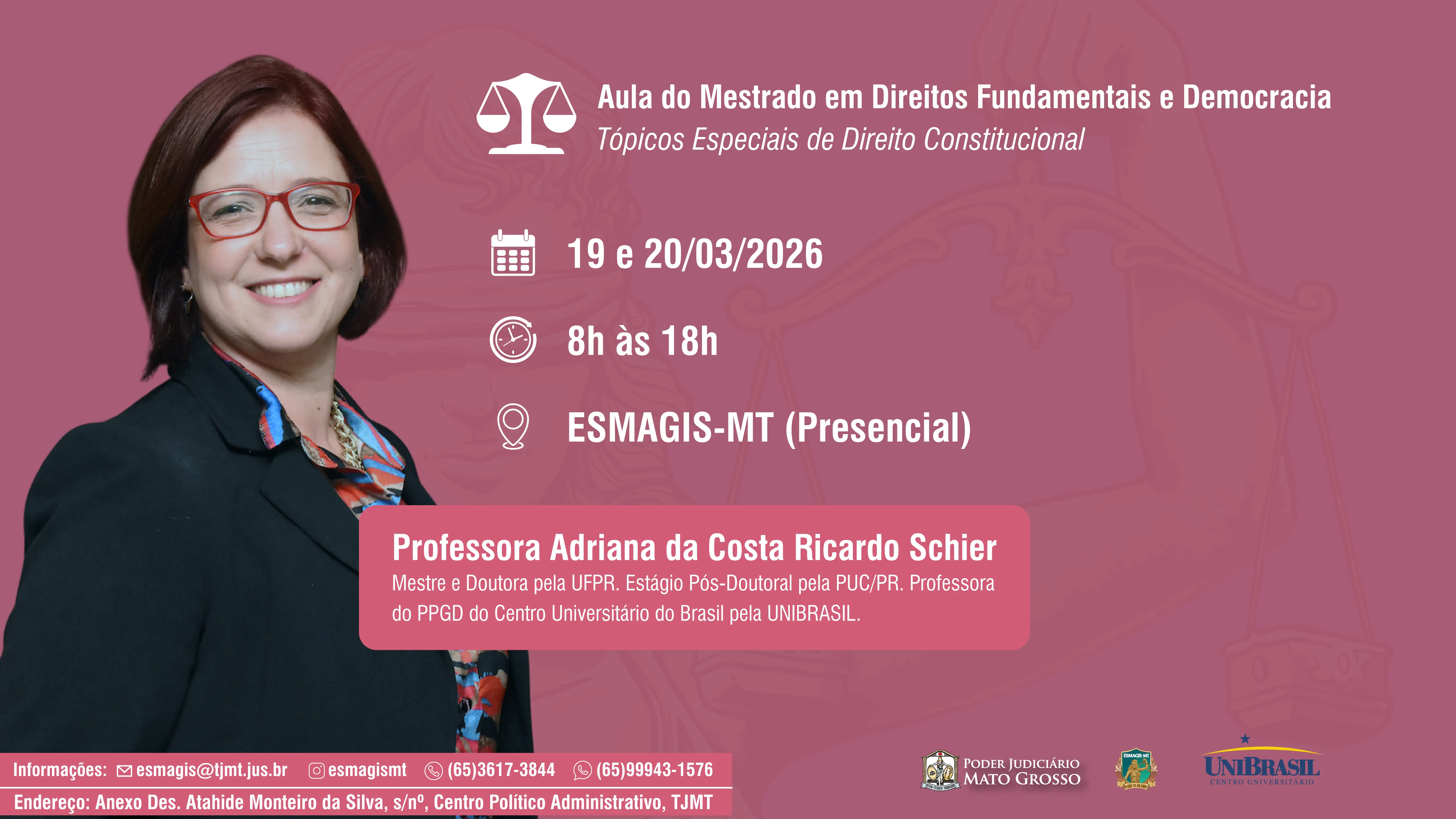 Nesta quinta e sexta-feira (19 e 20 de março) será realizado mais um módulo referente às atividades acadêmicas do programa de “Mestrado em Direitos Fundamentais e Democracia”, com a oferta da disciplina presencial “Tópicos Especiais de Direito Constitucional”. O programa de pós-graduação é oferecido pela Escola Superior da Magistratura de Mato Grosso (Esmagis-MT) a magistrados do Poder Judiciário de Mato Grosso.