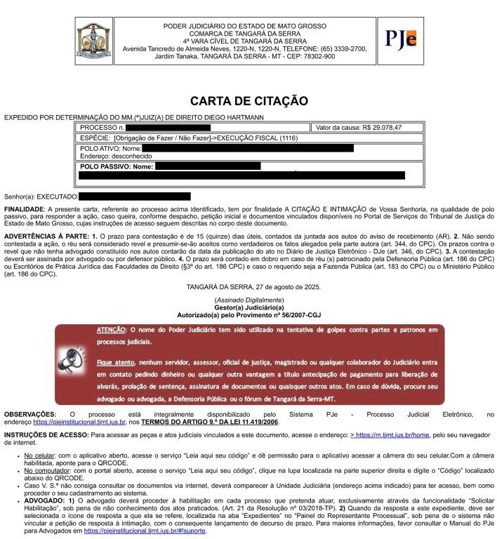 Diante desse cenário, a Comarca de Tangará da Serra (a 252 km de Cuiabá) adotou uma medida para reforçar a proteção da população. Todas as comunicações oficiais expedidas pelas 10 unidades da comarca (oito varas jurisdicionais, o Cejusc e a Direção do Foro) agora trazem um alerta na cor vermelha sobre a prática de fraudes (conforme a imagem ao lado).