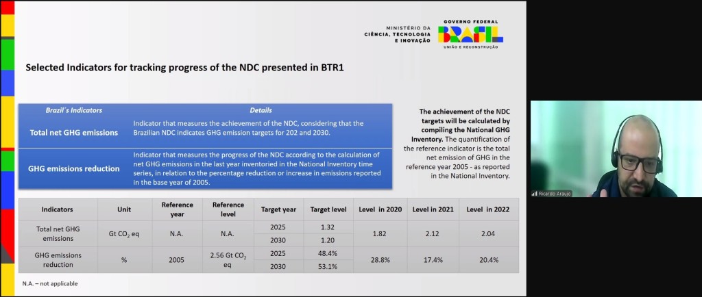 Araujo explicou que o Primeiro Relatório Bienal de Transparência do Brasil relatou dois indicadores de monitoramento do progresso da NDC brasileira: o total de emissões e as reduções alcançadas em 2022, tendo como comparativo o ano base de 2005. “Por mais que sejam apenas dois indicadores relativamente simples, o conjunto de dados apresenta subsídios para políticas públicas”, afirmou.
