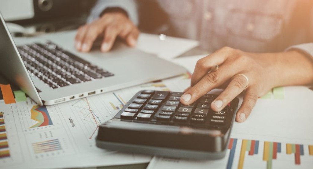 #PraTodosVerem: A imagem mostra uma pessoa utilizando simultaneamente um notebook e uma calculadora, com diversas planilhas e gráficos coloridos espalhados sobre a mesa. A cena transmite uma rotina de trabalho ligada à análise de dados, cálculos financeiros ou elaboração de relatórios contábeis, sugerindo foco e organização em atividades administrativas ou de planejamento.
