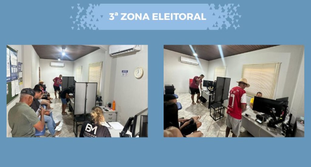 #PraTodosVerem: A imagem mostra duas cenas de atendimento eleitoral em uma sala simples. Em ambas, eleitores aguardam sentados enquanto servidores realizam procedimentos em computadores e equipamentos de biometria. O ambiente é organizado, com cadeiras e mesas, e os atendimentos parecem estar em andamento de forma tranquila. No topo, há o título “3ª ZONA ELEITORAL”.