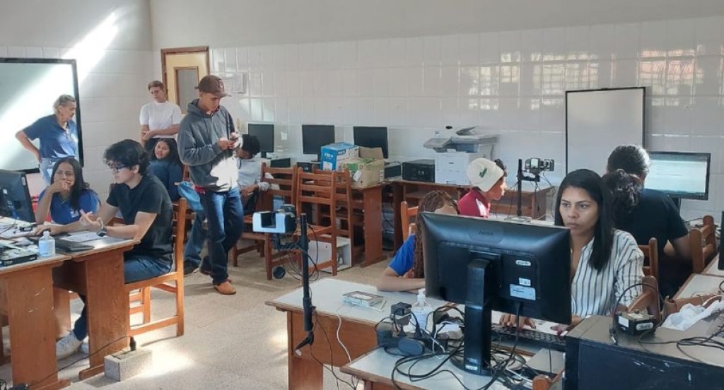 #PraTodosVerem – A imagem mostra uma sala equipada com computadores, onde vários adolescentes estão sendo atendidos pela Justiça Eleitoral. À frente, uma mulher opera um computador com equipamentos periféricos, fazendo atendimento eleitoral. Outras pessoas, incluindo alunos, estão sentadas ou em pé, interagindo e utilizando os computadores. A sala de aula apresenta paredes revestidas com azulejos brancos e mobiliário simples de madeira.