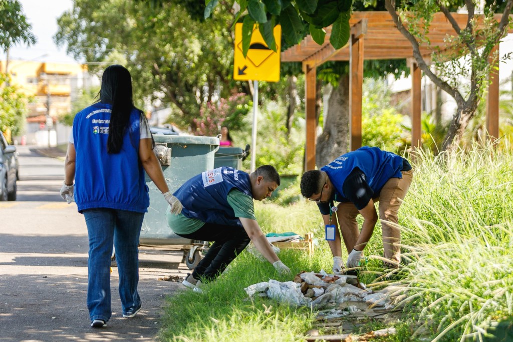 A imagem mostra três servidores da Secretaria Municipal de Saúde (SMS) envolvidos na ação de combate ao Aedes aegypti. Os profissionais estão realizando a limpeza de uma praça durante a operação de fiscalização de imóveis no bairro Dom Aquino. Todos vestem coletes azuis que os identificam como servidores da Prefeitura de Cuiabá.