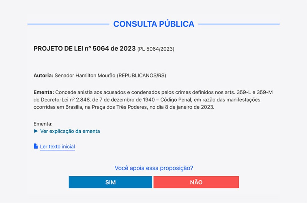 É IMPRECISA a mensagem que circula nas redes sociais sobre consulta pública para o PL 5.064/2023, que concede anistia aos acusados e condenados pelos atos de 8 de janeiro. A consulta pública para esse projeto está aberta desde o dia em que ele foi apresentado ao Senado: 19 de outubro de 2023. Ou seja, o Senado Federal não fez convocação específica para que as pessoas opinem sobre essa proposta neste momento.