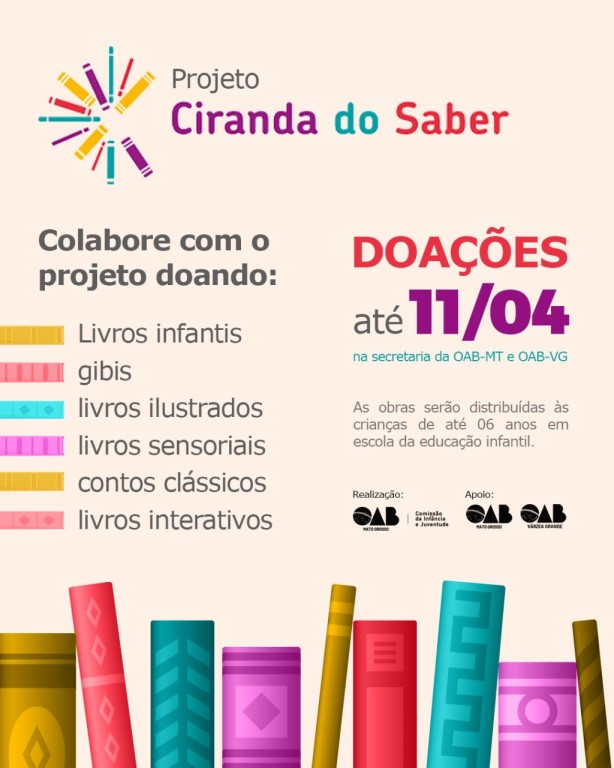 Em comemoração ao dia Nacional do Livro Infantil, comemorado em 18 de abril, a Ordem dos Advogados do Brasil – Seccional Mato Grosso (OAB-MT), por meio da Comissão da Infância e Juventude, com apoio da 5ª Subseção da OAB – Várzea Grande, está realizando a Campanha de Arrecadação de Livros Infantis. “O objetivo é, além de comemorar a data, contribuir para que as crianças tenham mais acesso à leitura, à cultura e ao conhecimento”, pontua Gisela Cardoso, presidente da OAB-MT. A iniciativa faz parte do Projeto Ciranda do Saber. Além de livros infantis, estão sendo arrecadados gibis, livros ilustrados, livros sensoriais, interativos e de contos clássicos.