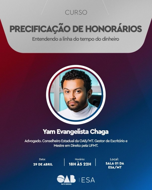 imgA Ordem dos Advogados do Brasil – Seccional Mato Grosso (OAB-MT) oferece nesta terça-feira (29), através da Escola Superior da Advocacia (ESA-MT), o curso Precificação de Honorários – Entendendo a Linha do Tempo do Dinheiro, que será ministrado pelo advogado Yam Evangelista, conselheiro seccional da OAB-MT e gestor de escritório.