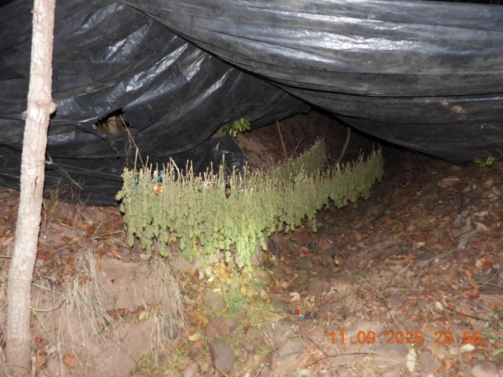 Próximo do local, foram encontrados centenas de pés de maconha em processo de secagem sob lona preta. Houve significativa devastação ambiental, com corte de árvores para demarcação de cerca.
