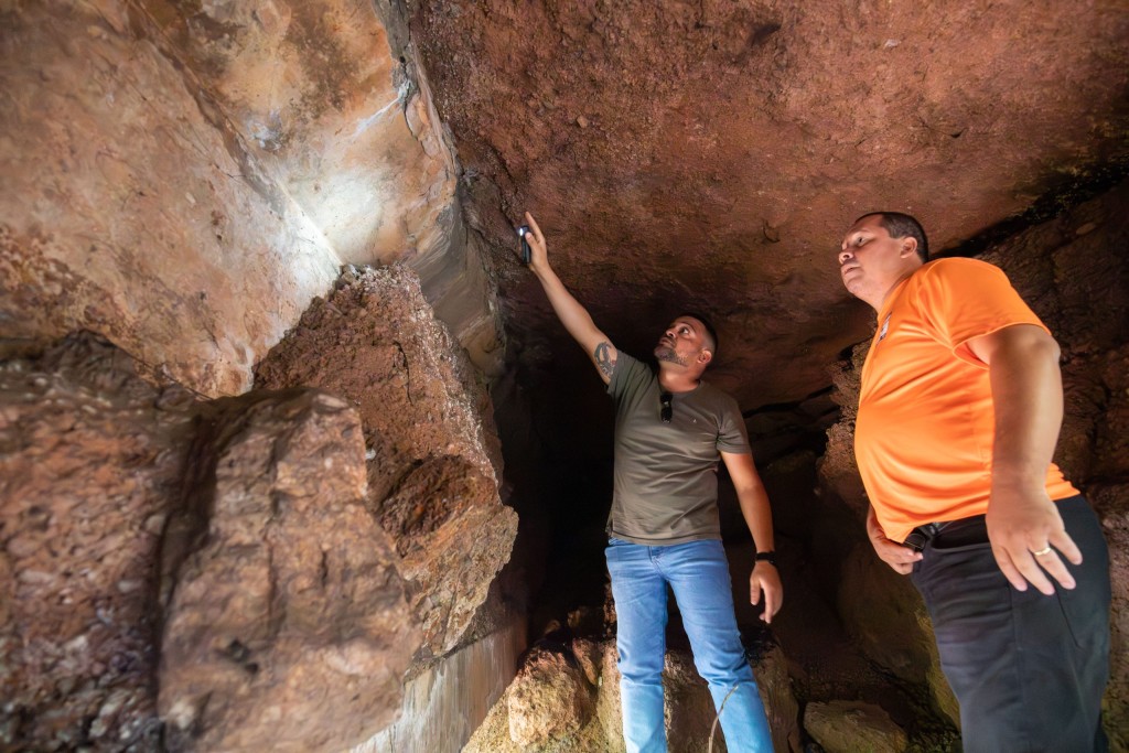 A foto mostra momentos da vistoria na estrutura embaixo da ponte, com o secretário Lucas Tavares apontando detalhes ao representante da Defesa Civil.