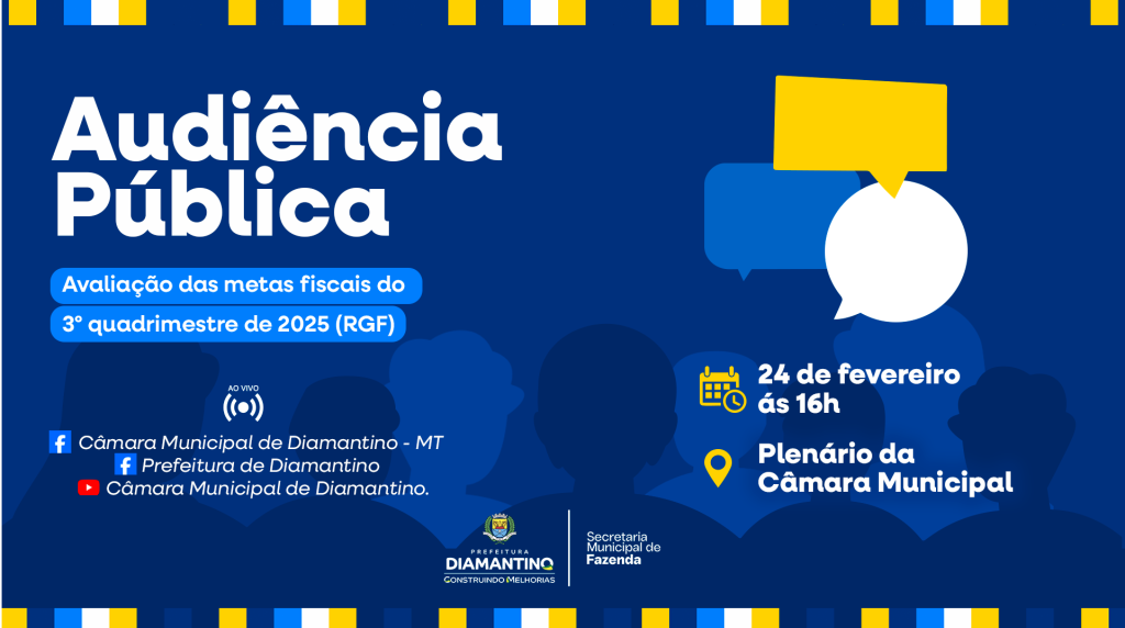 A Prefeitura de Diamantino por meio da Secretaria Municipal de Fazenda convida toda a população para participar da audiência pública de avaliação do cumprimento das metas fiscais referentes ao 3º quadrimestre de 2025. O encontro tem como objetivo garantir transparência na gestão dos recursos públicos e ampliar a participação cidadã.
