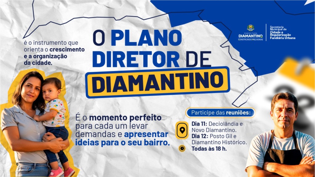 A Prefeitura de Diamantino, por meio da Secretaria Municipal de Cidades e Regularização Fundiária Urbana, convida toda a comunidade para participar das reuniões de elaboração do Plano Diretor Municipal, que serão realizadas nos dias 11 e 12 de novembro de 2025.