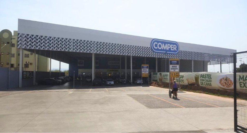 #PraTodosVerem: A imagem mostra a fachada do supermercado da rede Comper, unidade Belvedere. Em frente, há um amplo estacionamento com algumas vagas disponíveis e poucas pessoas circulando, incluindo uma pessoa empurrando um carrinho de compras. A entrada do supermercado está coberta por uma grande estrutura branca com detalhes geométricos, e há banners de promoções fixados nas grades ao lado.