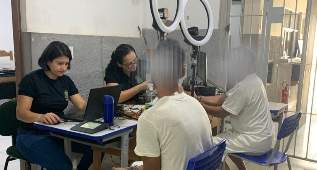 #PraTodosVerem – Na imagem, duas servidoras da Justiça Eleitoral realizam atendimento a reeducandos dentro de uma unidade prisional. Elas estão sentadas em mesas com equipamentos de coleta biométrica, como computador, leitor digital e iluminação de anel de luz, enquanto os detentos, vestidos com roupas brancas, passam pelo procedimento de revisão eleitoral. O ambiente é simples, com paredes em tom cinza e divisórias metálicas ao fundo.