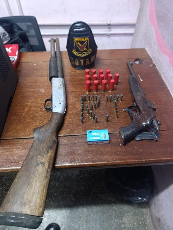 Na propriedade rural, os policiais apreenderam uma espingarda e uma garrucha, além de cartuchos. O suspeito proferiu diversas ameaças contra os policiais militares. O homem foi encaminhado à delegacia para registro do boletim de ocorrência.