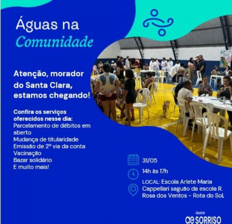 A mobilização será realizada das 14h às 17h, na Escola Arlete Maria Capellari, situada na Rua Rota dos Ventos, n.º 1052, no bairro Rota do Sol. Durante o evento, a concessionária Águas de Sorriso oferecerá negociação de débitos, atualização cadastral, emissão de segunda via da fatura, entre outros atendimentos ao consumidor.