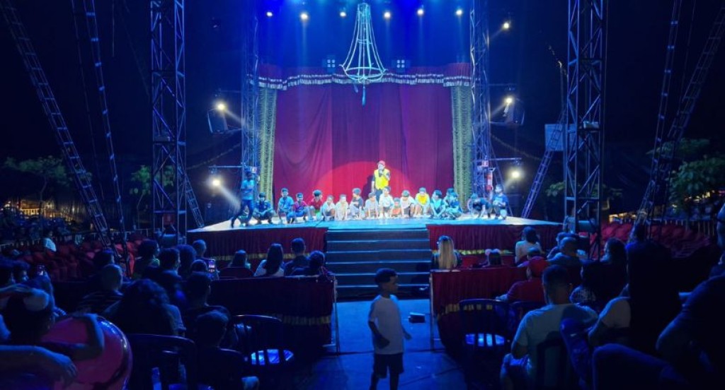 #PraTodosVeremA imagem mostra o interior de um circo durante uma apresentação noturna. No picadeiro, diversas crianças estão sentadas em fila, acompanhadas por artistas circenses sob luzes azuis e um foco central. Ao fundo, há uma cortina vermelha iluminada e uma estrutura metálica que sustenta o palco. Na plateia, famílias assistem atentamente ao espetáculo, criando um clima de alegria e descontração.