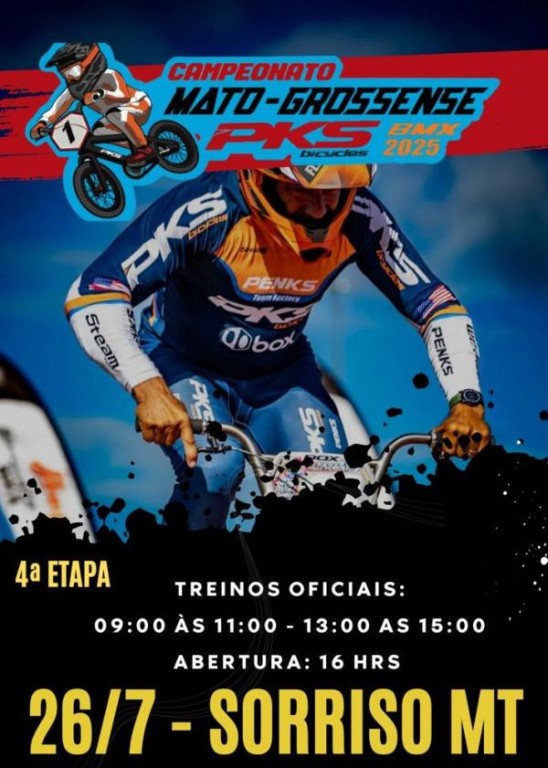 Neste sábado (26), Sorriso será o destino dos apaixonados por adrenalina e velocidade com a realização da 4ª etapa do Campeonato Mato-grossense PKS de BMX 2025. A competição será realizada no Complexo Esportivo Fernando Luiz, a partir das 16h, e reunirá 142 pilotos de várias cidades do Estado, como Nova Mutum, Lucas do Rio Verde, Cláudia, Sinop, São José do Rio Claro e Sorriso.
