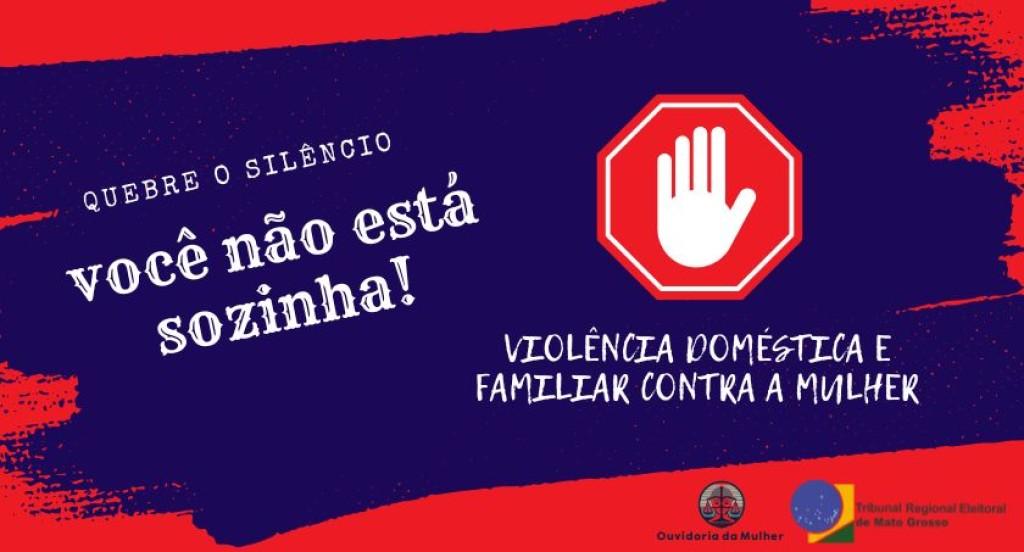 #DescriçãodaImagem: Card da campanha “Quebre o Silêncio. Você não está sozinha!”, do TRE-MT. Fundo vermelho e azul. À esquerda, a frase principal em destaque. À direita, símbolo de pare com uma mão e o texto “Violência doméstica e familiar contra a mulher”. Logos da Ouvidoria da Mulher e do TRE-MT no rodapé.