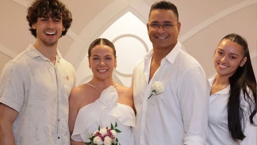 Casados há 24 anos, o vocalista do Harmonia do Samba e a dançarina celebraram o aniversário de casamento no último dia 25. Eles são pais de Camilly Victória, de 23 anos, e Victor Alexandre, de 22.